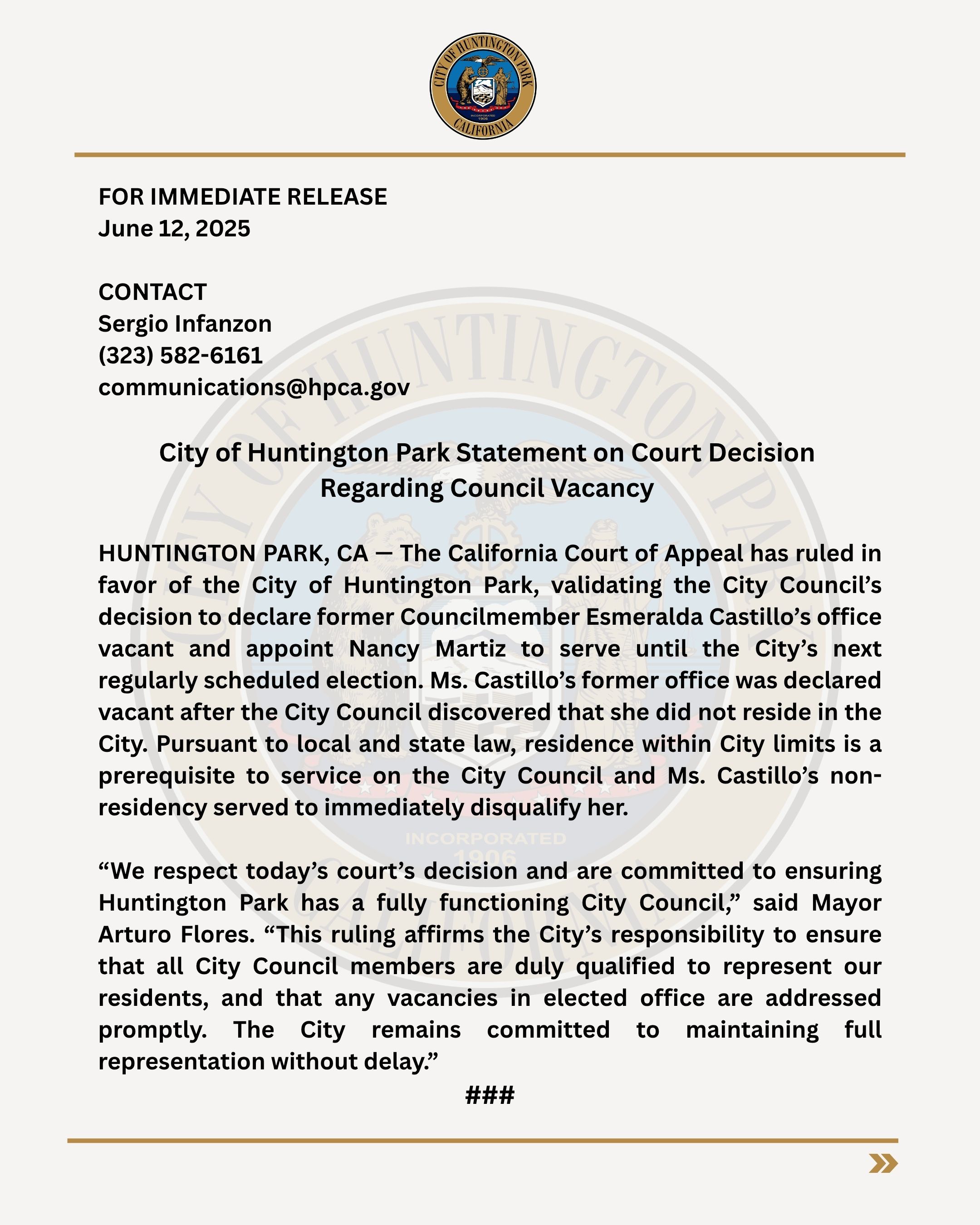 Media release - City of Huntington Park Statement on Court Decision Regarding Council Vacancy - 061225